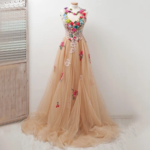 Vestidos de baile de graduación coloridos encantadores de flores sin mangas de tul Línea A apliques largos hasta el suelo sin espalda vestidos de fiesta y banquete | Aliexpress
