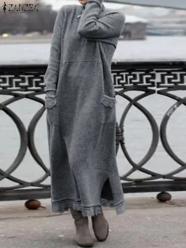 ZANZEA-vestido de encaje de ganchillo para mujer, jersey de manga larga con cuello redondo y capucha, color liso, para Otoño e Invierno | Aliexpress