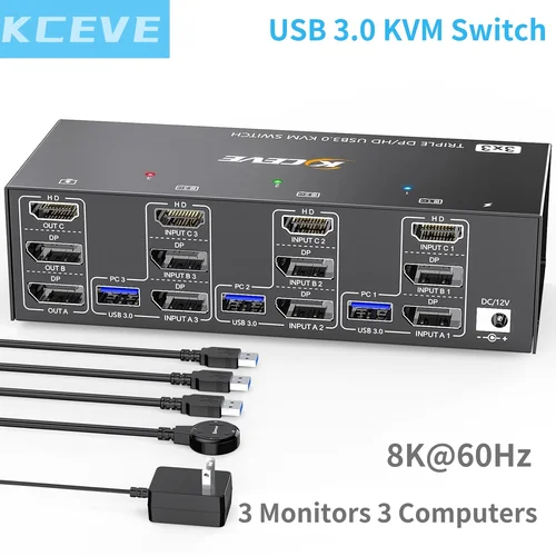 KCEVE HDMI USB 3.0 KVM Switch 3 Monitores 3 Computadoras 8K@60Hz 4K@144Hz Triple Monitor KVM con 4 Puertos USB 3.0 KVM Tripl | Aliexpress