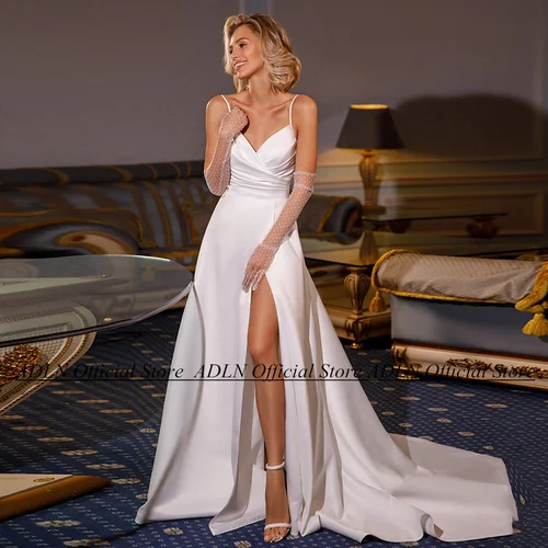 Vestido de novia de satén con cuello en V, Sexy, personalizado, tirantes finos, abertura larga, tren de barrido, corsé en la espalda, vestido de novia para mujer | Aliexpress