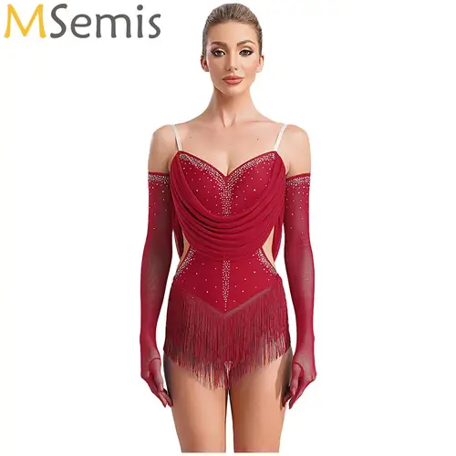 Leotardo de baile latino con borlas de malla fruncida para mujer, traje recortado con diamantes de imitación brillantes y flecos con guantes, disfraz de escenario actuación | Aliexpress