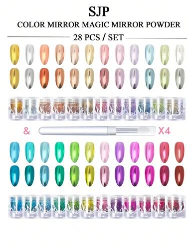 28 unids/set espejo mágico cromo polvo de uñas/decoración de brillo brillante/placa de manicura metálica plisada de titanio/juego | Aliexpress