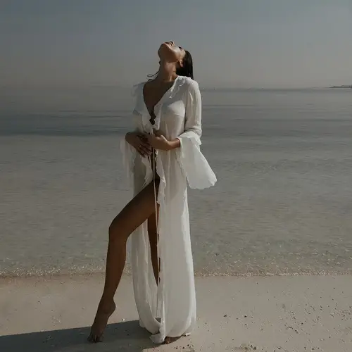 Nueva túnica de gasa para cubrir la playa, vestido con protección solar, ropa de playa para mujer, ropa Sexy con cuello en V, manga larga con volantes, negro y blanco | Aliexpress