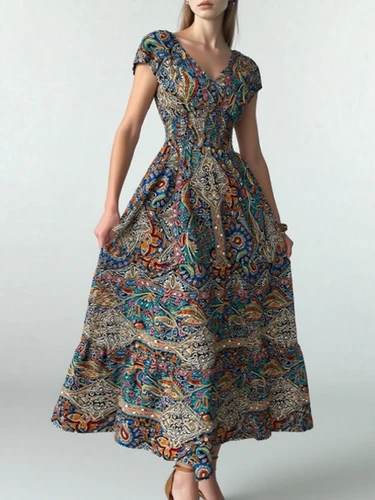Vestido estampado de estilo bohemio de verano, vestido informal acampanado con cintura elástica y cuello en V, vestidos sin mangas de talla grande, ropa de mujer 8080 | Aliexpress