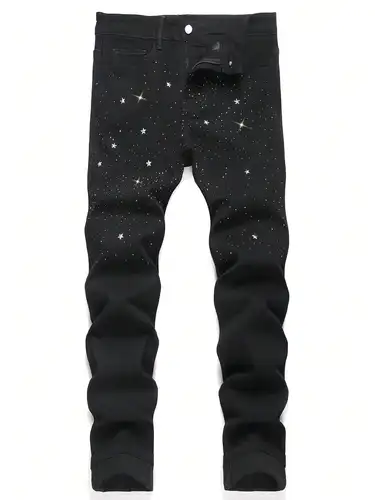 Pantalones vaqueros ajustados elásticos negros adornados con diamantes de imitación de moda para hombre, estilo de cuatro estaciones | Aliexpress