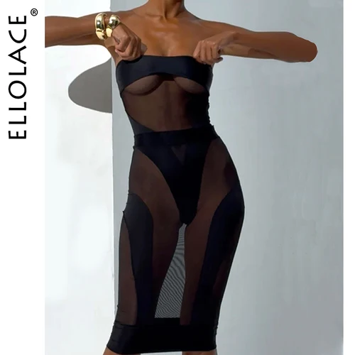 Ellolace-lencería Sexy elegante, mono transparente sin tirantes, medio vestido, conjunto de 2 piezas, traje de Reina de fiesta de empalme seductor | Aliexpress
