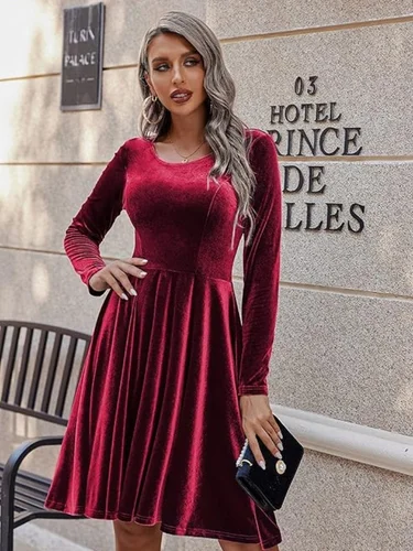 2025 Otoño Invierno mujer manga larga terciopelo Swing vestido cuello redondo multicolor para elegantes aspecto Retro | Aliexpress