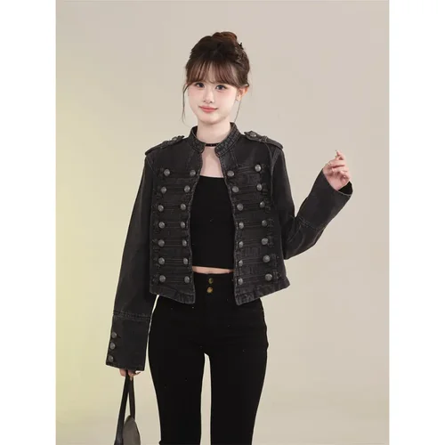 Chaqueta corta de inspiración militar vaquera Retro americana para mujer, abrigo informal de manga larga con cuello levantado para motocicleta | Aliexpress