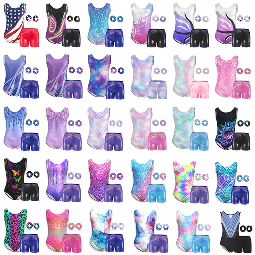 Leotardos de gimnasia para niñas, 4 piezas, mono de baile brillante, trajes atléticos para niños pequeños con pantalones cortos y diadema | Aliexpress