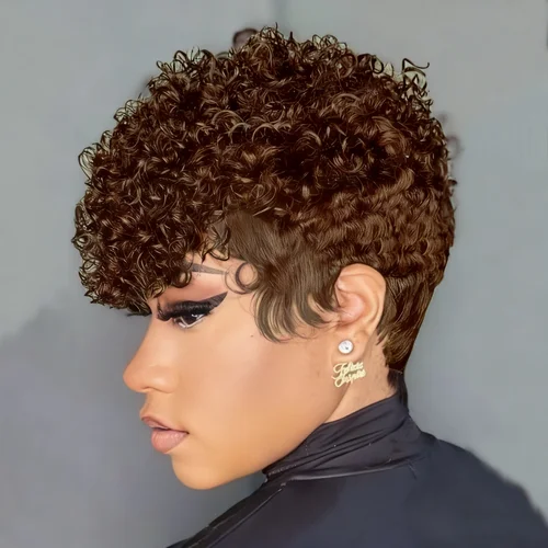Peluca corta de corte Pixie de cabello humano negro Natural para pelucas rizadas onda de borde urbano hecha a máquina completa para mujeres | Aliexpress