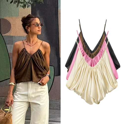 Tops deslizantes para mujer, Top sin mangas con cuello en V plisado de satén a la moda, Tops elegantes sexis de verano para mujer | Aliexpress