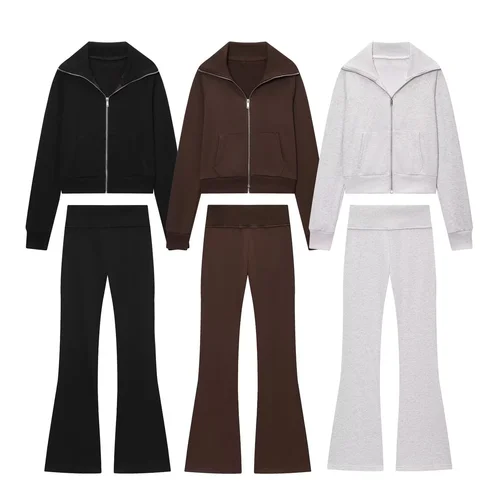 2025 otoño nueva chaqueta polar informal de manga larga con solapa y cremallera para mujer + pantalones acampanados de rizo de cintura alta | Aliexpress