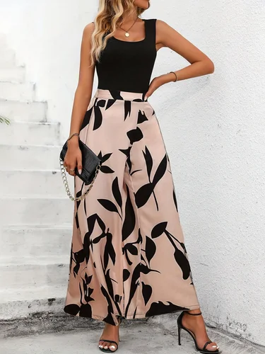 Elegante conjunto con estampado de hojas, perfecto para uso casual o vacaciones de todos los días. El conjunto de dos piezas incluye una camiseta y pantalón de punto. | Aliexpress