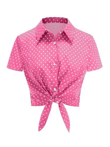 Tonval, Tops cortos de verano de manga corta con botones y cuello vuelto para mujer, camisas y blusas Vintage de lunares con dobladillo con lazo 2026 | Aliexpress