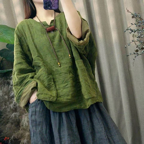 Camiseta de Mujer de Manga Larga con Cuello Redondo, Estilo Artístico, Doble Capa de Algodón y Lino, con Bolsillos y Parches, Nueva Colección Primavera 2026, Y189 | Aliexpress