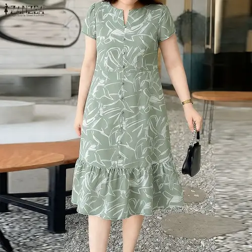 ZANZEA-vestido Midi informal con estampado Floral para mujer, vestido largo con cuello en V y manga corta con dobladillo con volantes, vestido largo para uso diario de verano, 3XL | Aliexpress