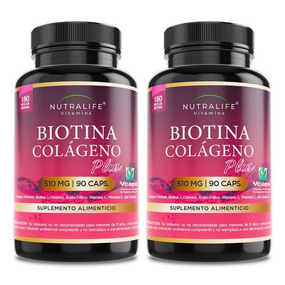 Pack 2 Biotina + Colágeno Hidrolizado 180 Caps Nutrilife+ Sin Sabor