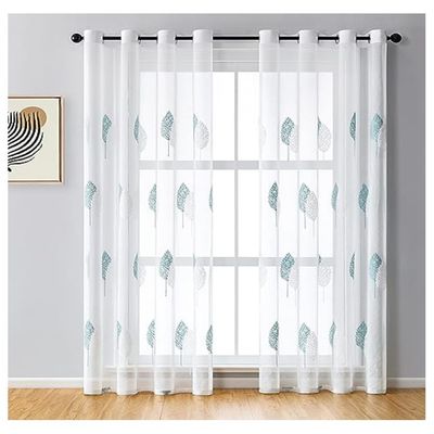 Set X 2 Visillos Blancos Bordados Hojas Blancas Turquesa 140x230 Cm | Falabella