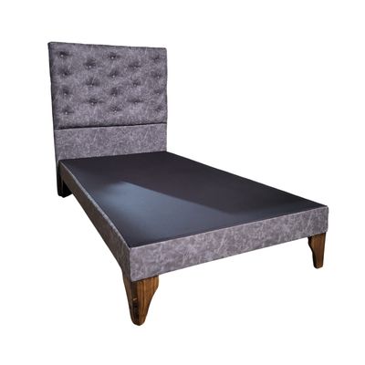 Base Cama Europea 1.5 plazas + Respaldo a Piso Negro Eco Cuero Botón Diamante