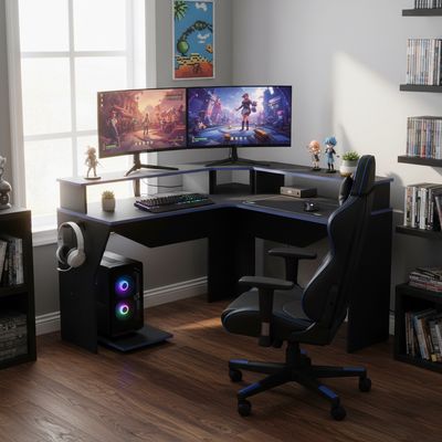 Escritorio Esquinero Forma LT Estantes Gamer 72x1x50 CM Negro Negro / 20X20X20 CM / MDF