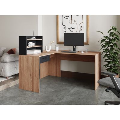 Fmfurniture - Escritorio En L 1 Cajon Y Estantes Fm-002C Café Claro Y Negro