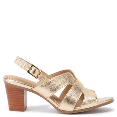 Elegante sandalia de cuero dorado con forro cómodo.
