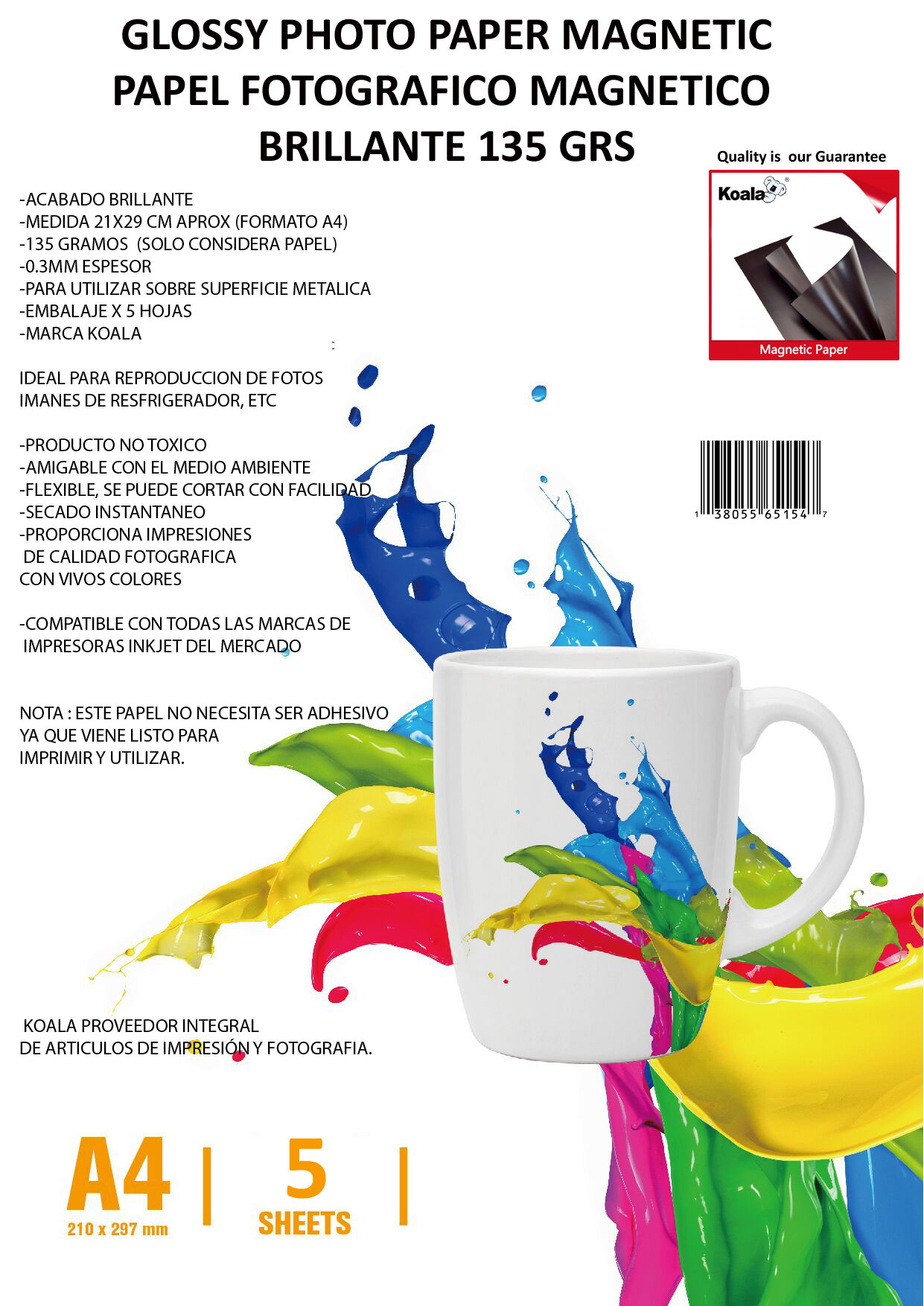 Arkolor - Papel Fotográfico Glossy Magnético Imántado 5 Hojas A4-Koala | Lider Electrohogar