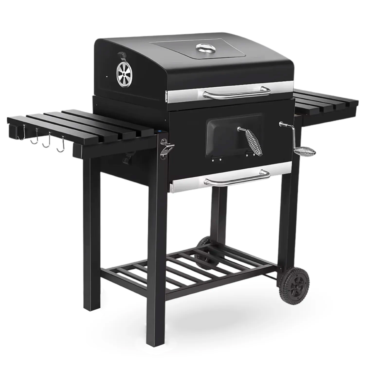 Disfruta de tus asados al aire libre con esta parrilla a carbón con tapa y bandejas laterales. ideal para terrazas y jardines. fácil de mover, resistente y perfecta para lograr el sabor ahumado que tanto te gusta.