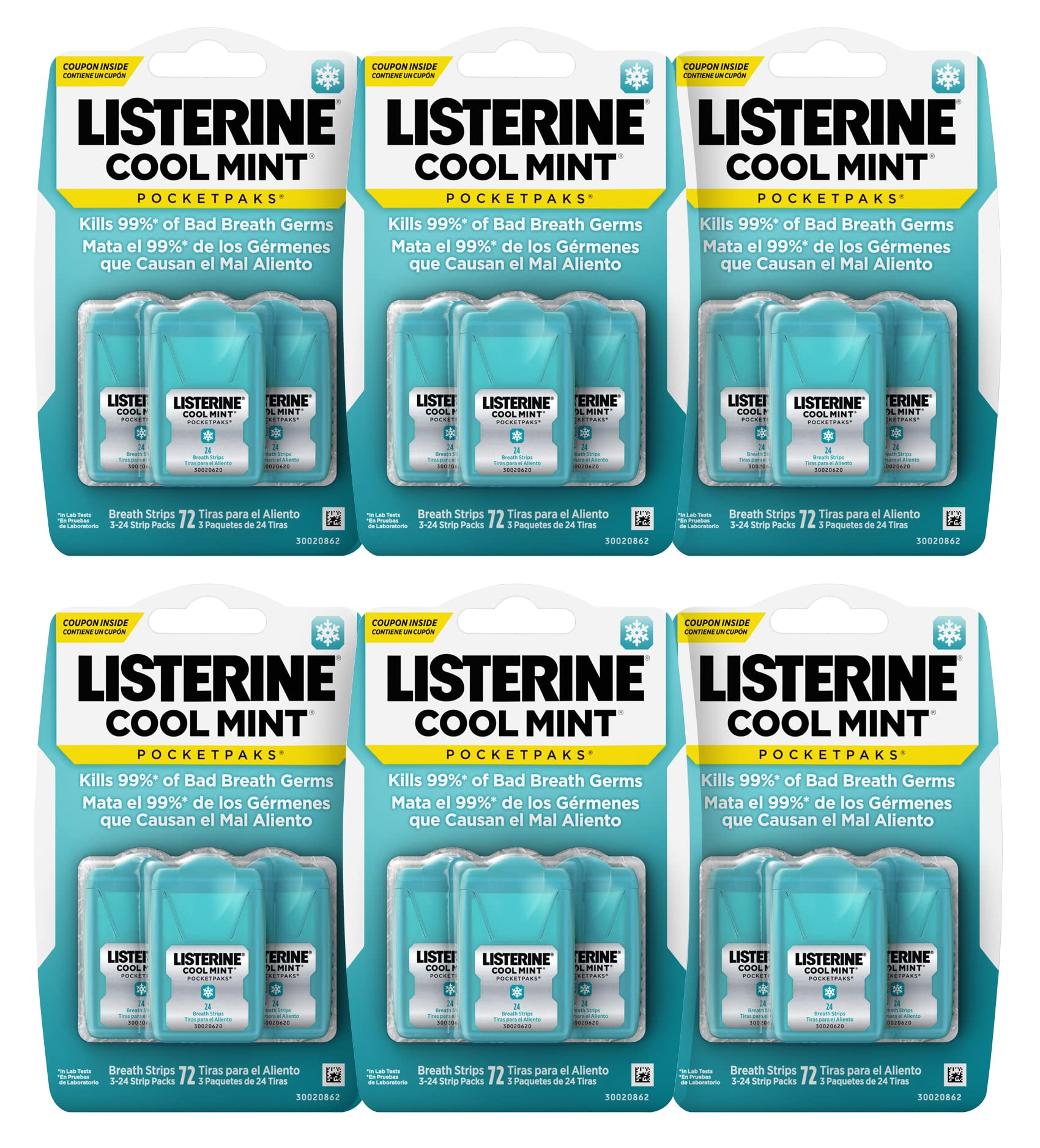 Listerine cool mint pocketpaks tiras portátiles para el mal aliento, tiras para el aliento fresco que eliminan el 99% de los gérmenes del mal aliento*, sabor a menta fresca, 72 unidades (paquete de 6) - paquete de 6, 3 paquetes con 24 tiras cada uno de listerine cool mint pocketpaks tiras para el mal aliento, eliminan eficazmente los gérmenes del mal aliento y refrescan el aliento en cualquier lugar con su sabor a menta fresca. - las tiras de menta para el aliento eliminan el 99% de los gérmenes que causan el mal aliento, según pruebas de laboratorio, y te dejan un aliento fresco para ocasiones y reuniones importantes. - descubre un aliento fresco en un solo paso con un paquete portátil de tiras refrescantes de menta. estas tiras de bolsillo se disuelven al instante para eliminar los gérmenes que causan el mal aliento, dejando tu boca limpia y fresca. - protégete contra los gérmenes del mal aliento en cualquier lugar con estas prácticas tiras portátiles de menta para el aliento fresco. perfecto para un aliento fresco de fácil acceso y para eliminar los gérmenes del mal aliento dondequiera que esté. - para usar, extraiga una tira de cuidado bucal del práctico estuche, colóquela en la lengua y deje que se disuelva. úsela según sea necesario para refrescar el aliento y eliminar los gérmenes del mal aliento.