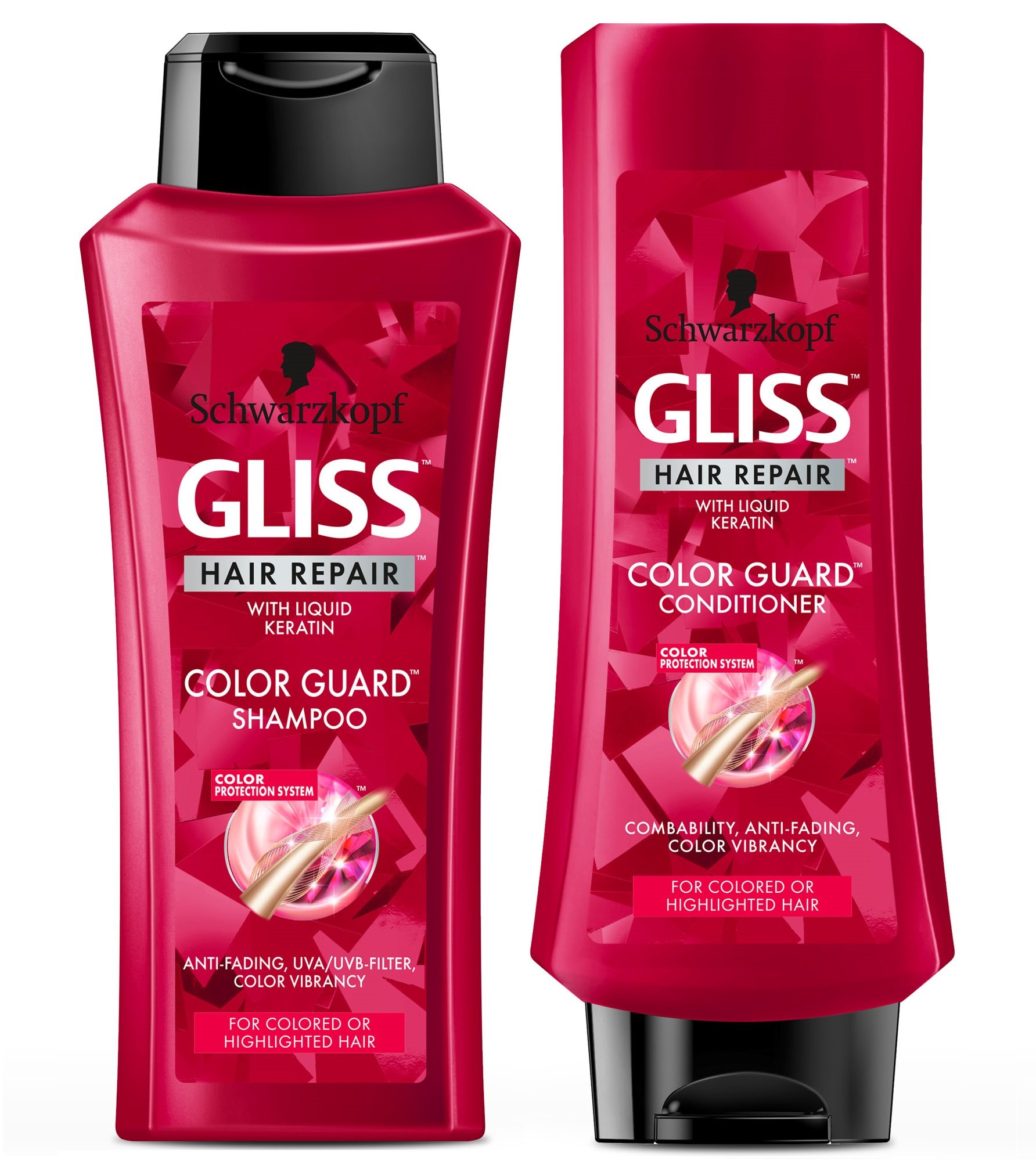 Set protector de color gliss hair repair con champú y acondicionador para cabello teñido o con mechas, 13.6 onzas líquidas (paquete de 2) : con un filtro uva/uvb, esta fórmula ayuda a evitar que el color se decolore para una retención óptima del color y una hermosa luminosidad. - lavándolo con frecuencia evita que el cabello teñido, teñido o con mechas pierda su color. - los ingredientes especiales reparan y restauran el cabello dañado. - los ingredientes antiendecoloración preservan el color del cabello hasta 12 semanas en comparación con el cabello sin tratar. - el paquete incluye una botella de champú de 13.6 onzas y una botella de acondicionador de 13.6 onzas.