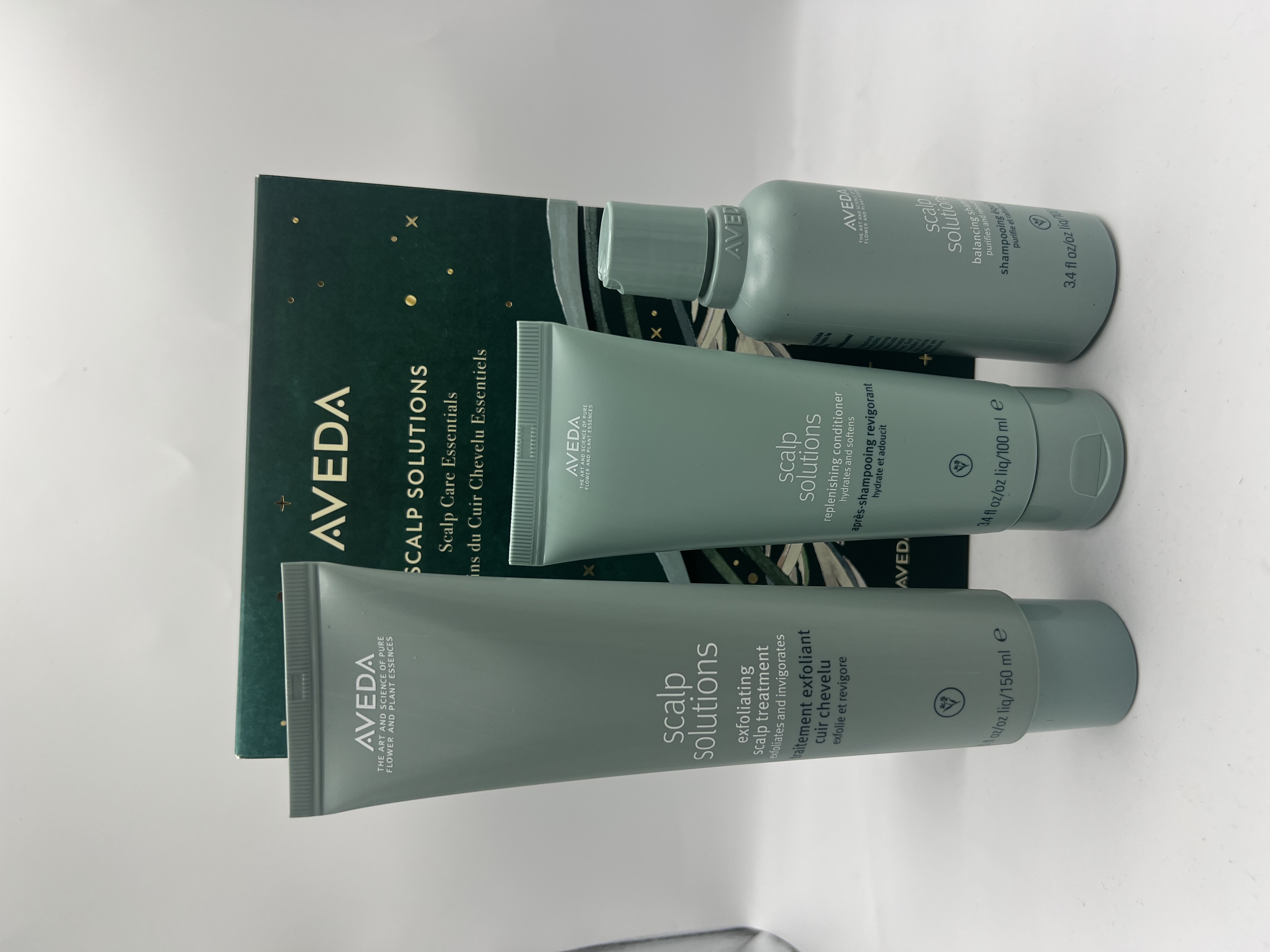 Scalp solutions scalp care essentials gift set this limited-edition scalp solutions gift set includes balancing shampoo 3.4 oz/100 ml • gently cleanses to help remove excess oil, impurities and pollution, improving scalp hydration by 92% after 1 week* replenishing conditioner 3.4 oz/100 ml • hydrates and replenishes hair and scalp, improving scalp hydration by +92% after 1 week* exfoliating scalp treatment 5 oz/150 ml • instantly removes sebum, product build-up, and surface pollution without disrupting the scalp barrier suitable for - all hair types - all hair textures: straight (1a – 1c), wavy (2a – 2c), curly (3a – 3c), and coily (4a – 4c) - all scalp types aroma clean, uplifting aroma with bright citrus notes of lemon and orange on a light floral heart of neroli, balanced by delicate hints of crisp, cool mint.