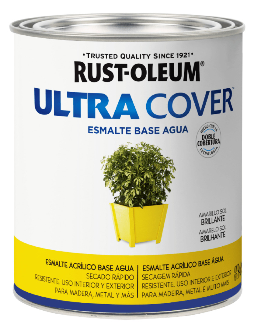 Esmalte al agua ultra cover 946ml amarillo sol brillante - rust oleum. rust-oleum® ultra cover® es una pintura base agua, multipropósito y ultra cubritiva de secado rápido. su fórmula de alta calidad se aplica más fácilmente con brocha o pincel y oculta mejor las imperfecciones; ¡es ideal para proyectos de mayor tamaño!. rust-oleum® ultra cover® completa el proyecto en menos tiempo y en menor cantidad de capas, por lo que es la opción ideal tanto para expertos como para proyectos de tipo “hágalo usted mismo” o diy. base agua: prácticamente no tiene olor, y los elementos utilizados para pintar se lavan fácilmente con agua. seca al tacto en sólo 30 minutos. queda totalmente seco en 2 a 4 horas. ultra cubritivo y resistente al descascarado y al desgaste. ideal para interior o exterior. puede aplicarse sobre madera, yeso, ¡y más!.