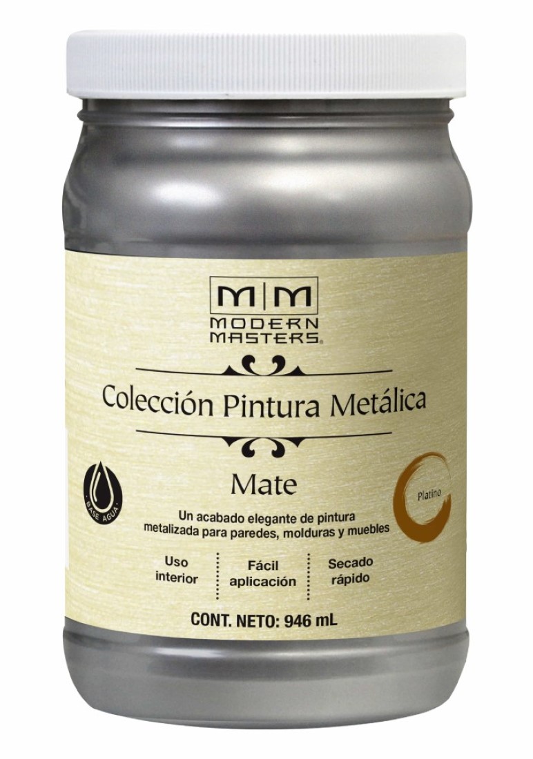 Pintura base agua metálica mate 946ml platino - modern masters. las pinturas metálicas mate de la línea modern masters® son base agua y de secado rápido. las pinturas de esta colección combinan mica y pigmentos tradicionales para crear la paleta de siete colores mate, que son inalterables, no se decoloran y están disponibles por primera vez en pintura base agua. son ideales para hotelería, locales comerciales, uso residencial, oficinas corporativas, casinos y parques temáticos. se pueden aplicar en superficies de madera, metal, plástico y paneles de yeso. base agua. perfecta para pintar muebles y paredes. uso interior (para superficies de exterior utilizar el protector modern masters). fácil aplicación. secado rápido.