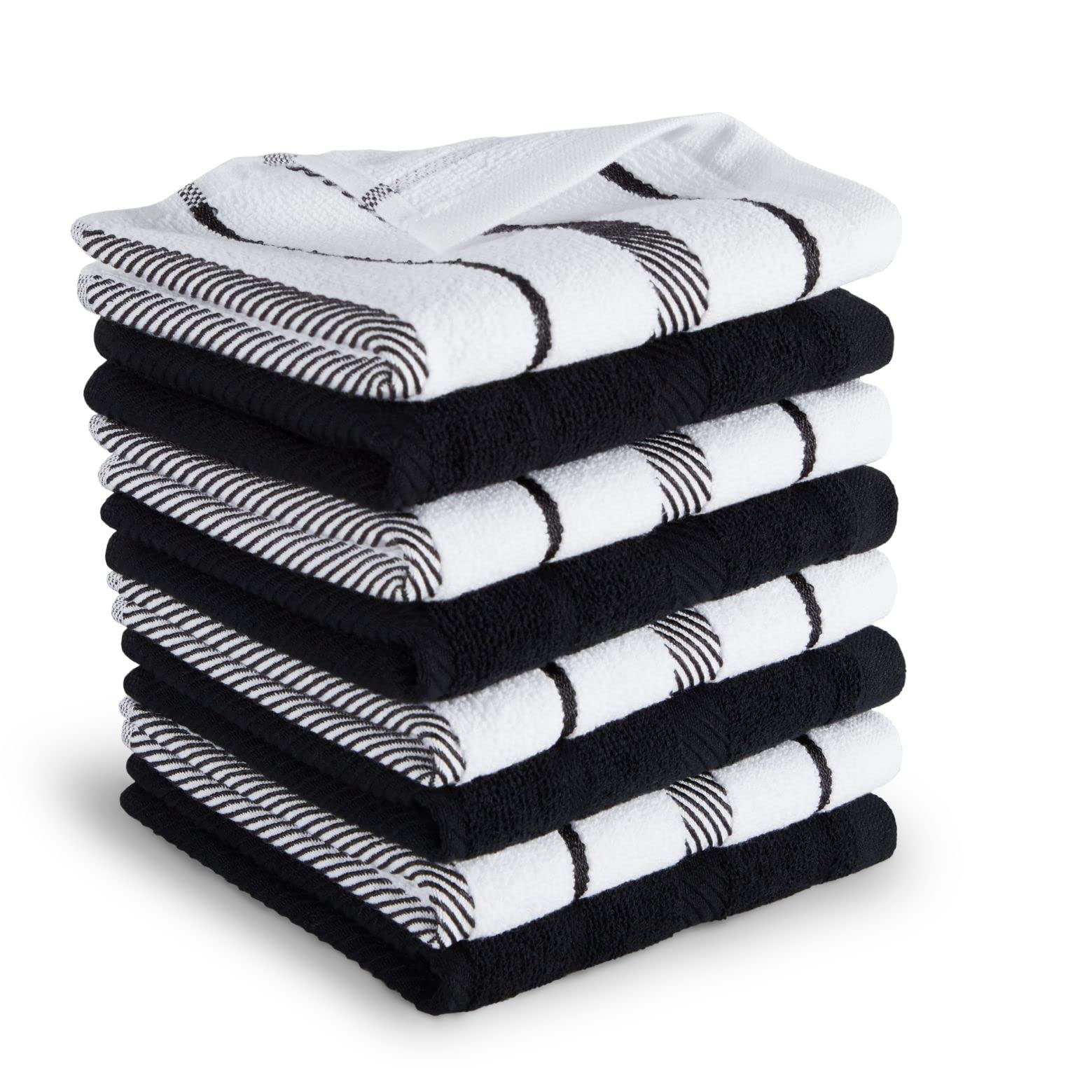 Kitchenaid albany - juego de 8 paños de cocina, ónix negro/blanco, 12 x 12 pulgadas - altamente absorbente: estos paños de cocina están hechos de algodón altamente absorbente y son ideales para limpiar derrames y limpiar. son toallas duraderas y ricas en algodón que son perfectas para las tareas diarias en la cocina o el baño. - juego de ocho pantallos: incluye cuatro (4) paños de cocina a rayas en blanco y negro y cuatro (4) paños de cocina negros sólidos. cada toalla de tamaño generoso mide 12 pulgadas de ancho x 12 pulgadas de largo. - diseño de rayas y color sólido: el diseño clásico de rayas añade un acento simple pero pulido a cualquier cocina, mientras que el paño de cocina de color sólido se convierte en un elemento básico durante tus tareas de cocina. - mezcla y combina: muestra tus paños de cocina con accesorios a juego de kitchenaid que incluyen paños de cocina adicionales, guantes de horno y agarraderas para un aspecto coordinado. - fácil cuidado: lavar a máquina en frío en ciclo suave con colores similares, solo blanqueador sin cloro, secar en secadora a baja temperatura, quitar rápidamente, no planchar.