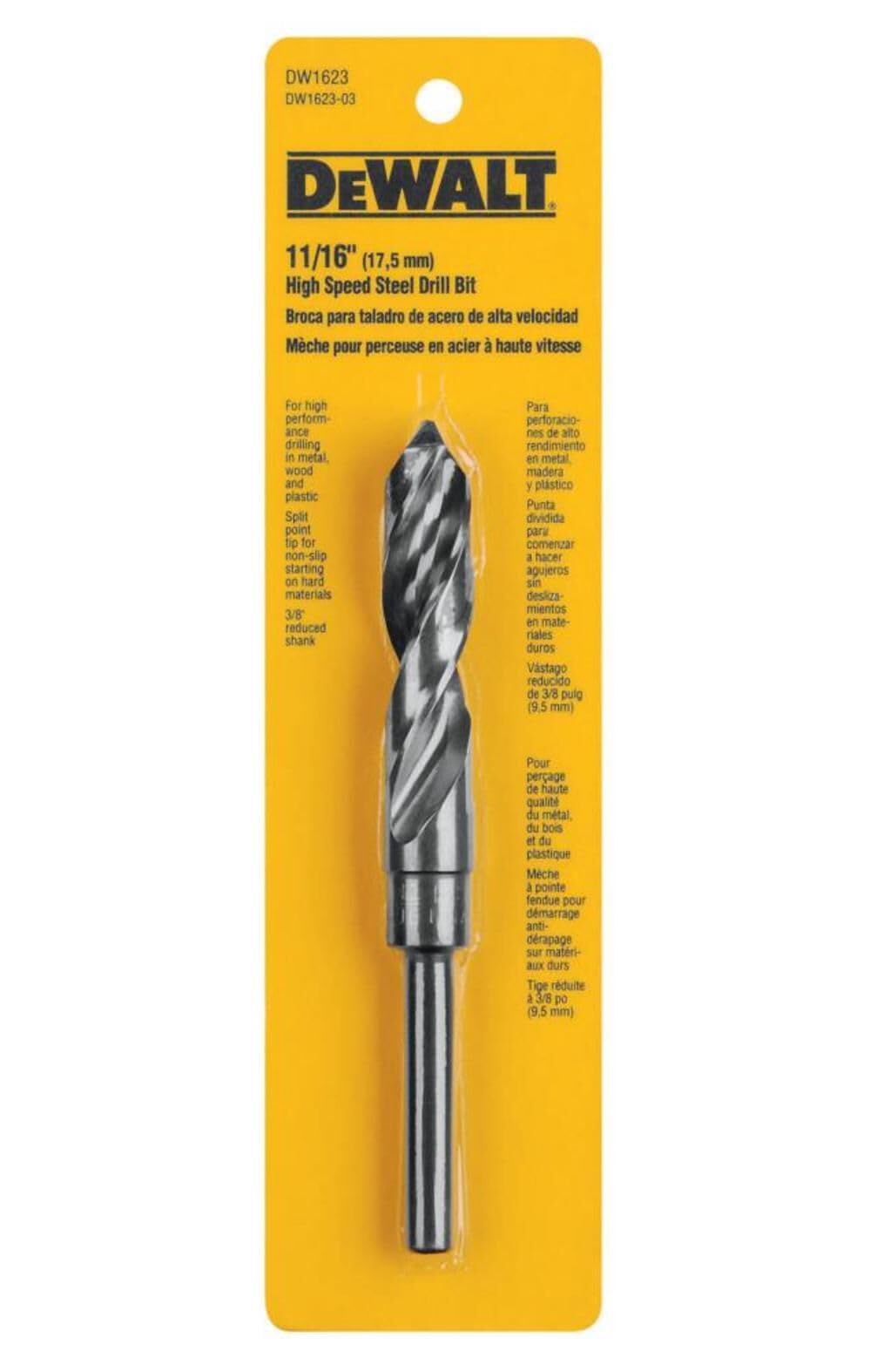 Dewalt dw1623 broca helicoidal con vástago reducido de óxido negro de 11/16 pulgadas - el diseño de flauta parabólica mejora la eyección de virutas en aplicaciones de perforación de metal y madera - revestimiento de óxido negro para una mayor resistencia al desgaste - taladros de punto de división de 135 grados al contacto y evita caminar - la hélice es de 31 grados, lo que minimiza la agresividad excesiva de una verdadera flauta parabólica