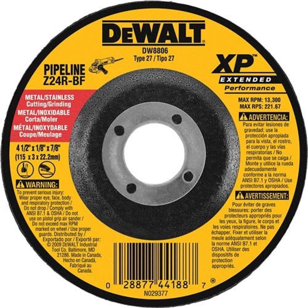 Dewalt dw8806 muela abrasiva de tubería de rendimiento extendido de 4 1 2 pulgadas por 1 8 pulgadas eje de 7 8 pulgadas *4 1 2" x 1 8" x 7 8" zirconia abrasiva