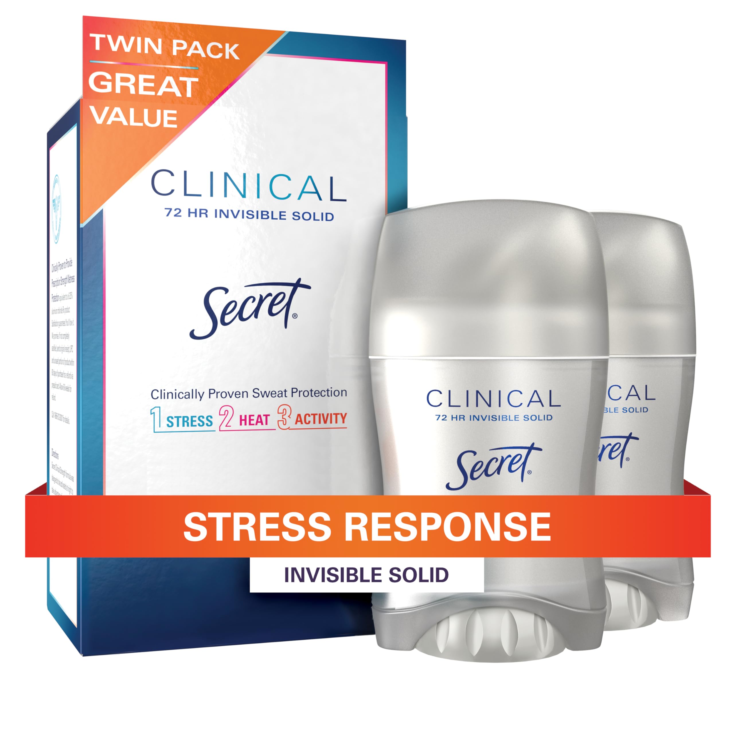 Antitranspirante y desodorante secret clinical strength para mujer, 3 veces más protección contra el estrés y el sudor, minerales que equilibran el ph, invisible solid, stress response, 1.6 oz (paquete de 2), protección clinical strength para combatir 3 tipos de sudor: estrés, calor y actividad, protección contra la humedad recetada clínicamente comprobada, 3 veces más protección contra el sudor por estrés (*en comparación con la protección contra la humedad que requiere un antitranspirante común) - diseñado con dermatólogas femeninas de peta