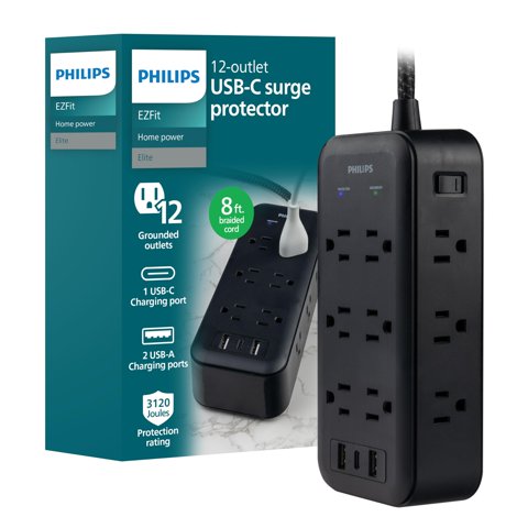 Protector Contra Sobretensiones Philips De 12 Salidas, 2 Usb-A, 1 Usb-C, 17 W, 3120J | Lider Electrohogar