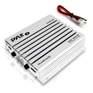 Pyle plmra400 amplificador de 4 canales, de 400 w, 4 canales - amplificador premium de 4 canales: el plmra400 de pyle está diseñado como un amplificador marino de 4 canales que permite una reproducción estéreo de alta calidad desde la fuente. esto encenderá tu altavoz y será universalmente compatible con una variedad de unidades principales - entrada estéreo rca: para un uso más fácil de este amplificador hidra marino, viene con entradas rca premium. si su receptor marino carece de conectores de salida rca, puede conectar cables de salida de altavoz a las entradas de terminal de alto nivel - protección corta: construido con un disipador térmico de aleación de aluminio resistente, protección contra cortocircuitos de sobrecarga térmica e indicador de luz led. estos son para proteger el amplificador y el sistema eléctrico de su vehículo de condiciones de cortocircuito - potente 400 vatios: este amplificador es potente con su fuente de alimentación mofset de 100 watt x 4 máx. o 400 watt. viene con doble entrada ajustable controles de nivel gain entre 1-300mv y 4 u 8 ohmios impedancia de altavoz - grado marino: con su calificación marina de ip-01, es resistente al agua. está construido con conectores de terminales de salida de altavoz chapados en oro, así como para combatir la corrosión con uso a largo plazo