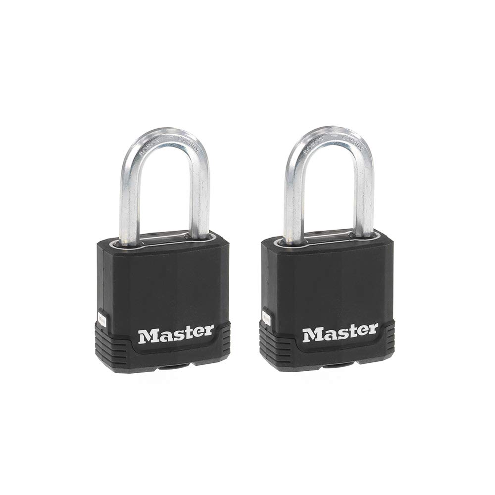 Master lock - candado magnum de acero laminado - cerradura al aire libre; el candado resistente con llave se utiliza mejor para almacenamiento al aire libre y vallas, unidades de autoalmacenamiento y taquillas, herramientas, cajas de trabajo y más. nota: mida el fondo de su puerta, el orificio cruzado y el grosor para asegurarse de que encuentre el ajuste correcto. - el bloqueo de llave cuenta con construcción de doble armadura: cuerpo de bloqueo de acero laminado con cubierta resistente a la intemperie y grillete octogonal de carburo de boro de corte duro es un 50% más duro que el acero endurecido - cilindro de 4 pines y bloqueo de doble rodamiento de bolas para una mayor resistencia a la palanca; chavetero cubierto y grillete para mayor protección contra la intemperie - 1-7/8 pulg (1.890 in) de ancho cuerpo de bloqueo; 5/16 pulgadas. grillete de 0.315 in de diámetro con 1-1/2 pulgadas. (1.496 in) de longitud, 13/16 pulgadas. (0.827 in) de ancho; grillete extendido para flexibilidad de aplicación - incluye dos candados con dos llaves; ambas llaves abren todas las cerraduras