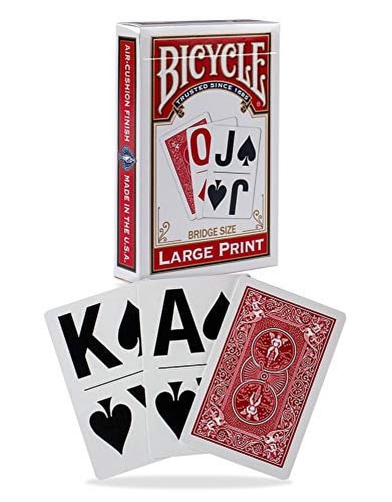 Descripción del producto ¡un buen juego de cartas debería desafiar tu mente, no tus ojos! disfruta jugando tus juegos de cartas favoritos sin tener que esforzarte para ver la mano que estás sosteniendo. las tarjetas de juego de tamaño de puente de impresión grande para bicicletas están diseñadas para ser más visibles, lo que facilita el juego de cartas para todos. estas tarjetas coloridas y con letras más grandes también son excelentes para enseñar juegos de cartas a jugadores más jóvenes. del fabricante las cubiertas para bicicletas® se fabrican en los estados unidos y cuentan con el acabado patentado de cojín™ de aire bicycle, bordes biselados suavemente y construcción de sándwich para mejorar el juego.