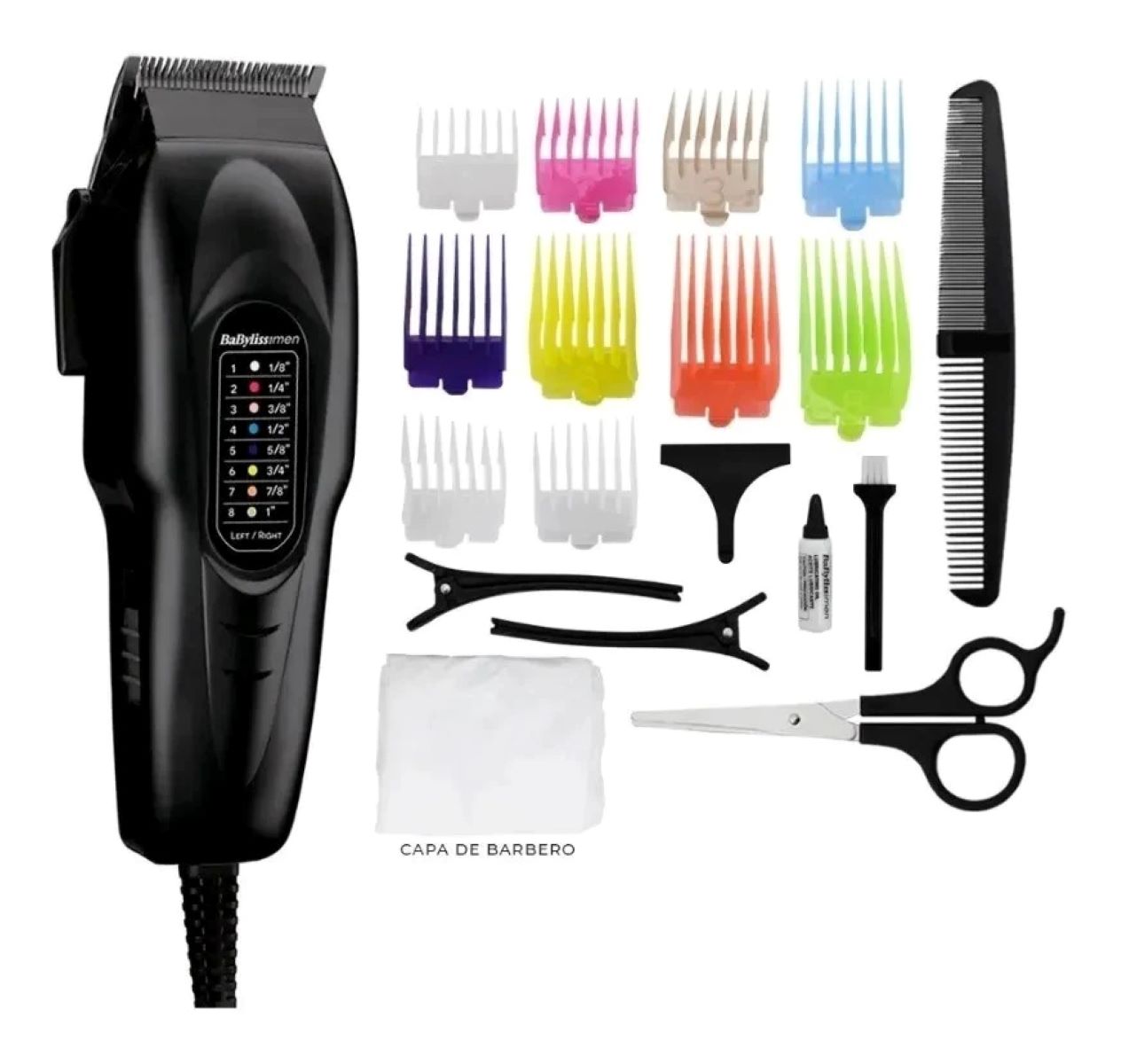 Capa de barbero. • peine de barbero. • tijeras de barbero. • 2 pinzas para el cabello. • aceite de limpieza. • cepillo de limpieza. • protector de cuchilla. • caja de almacenamiento de lujo. · cable de 1,85 mts.