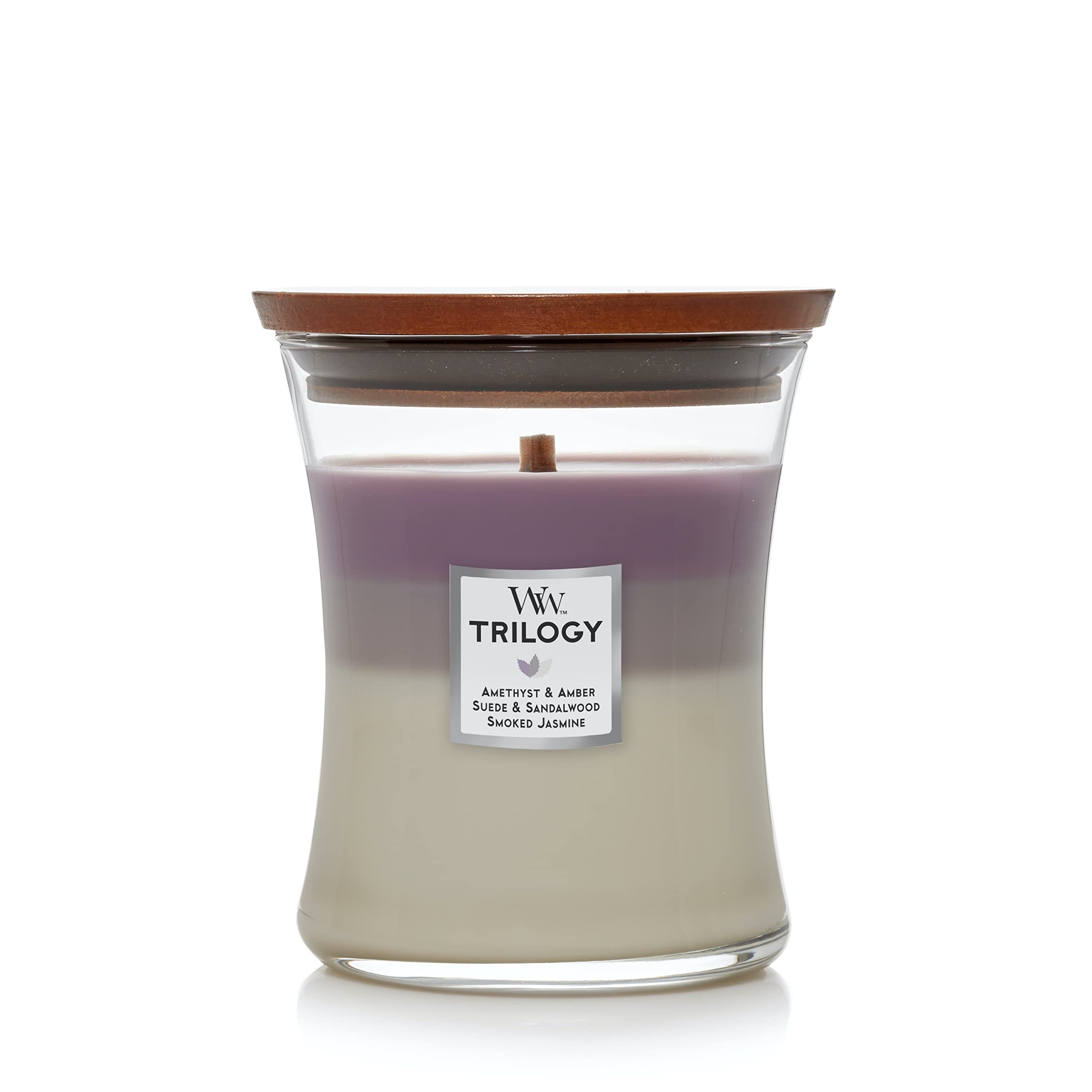 Woodwick - vela mediana en frasco, aroma amethyst sky, con forma de reloj de arena, cera de mezcla de soja, mecha de madera pluswick innovation, fabricada en estados unidos - cuenta con tres fragancias complementarias que crean una experiencia de aroma intrigante a medida que las capas se derriten y se mezclan. - la mecha patentada pluswick innovation mejora la experiencia con un sonido crepitante distintivo. - elaborado con una mezcla prémium de cera de soya y parafina.