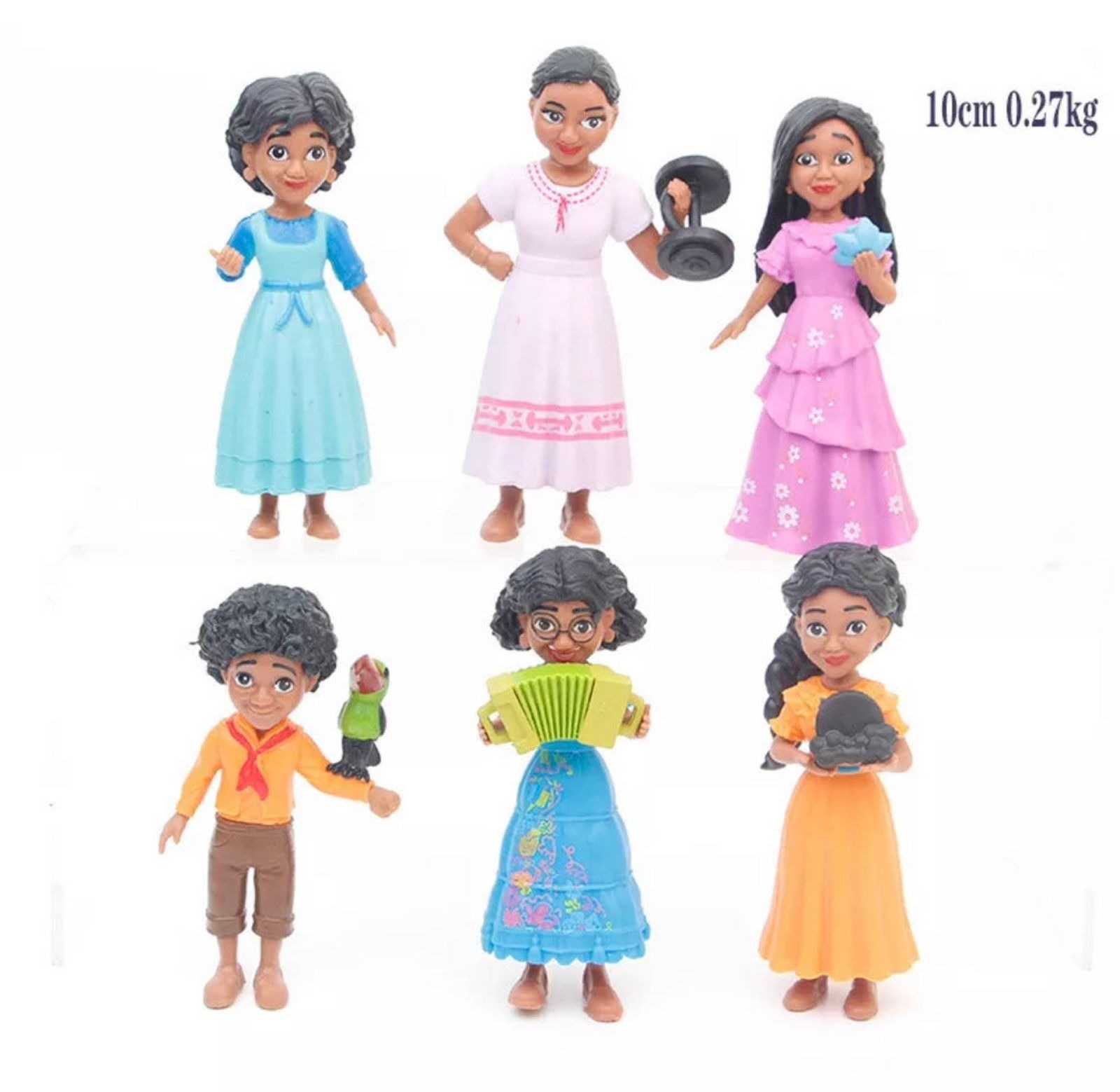 Set de 6 personales de encanto disney con sus accesorios, de alta calidad y colorido. 10 centímetros aproximadamente. incluye: - mirabel madrigal - isabela madrigal - luisa madrigal - antonio madrigal - pepa madrigal - julieta madrigal