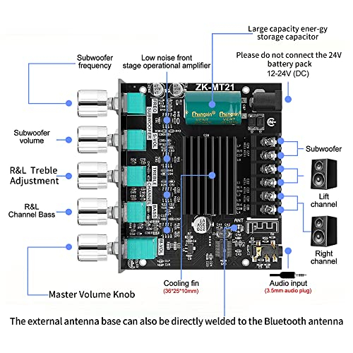 Placa amplificadora de potencia bluetooth con subwoofer 2.1 canales 50w × 2+100w, 12v-24v módulo amplificador de potencia de audio con control de agudos y bajos para diy audio bluetooth y tienda de cine en casa