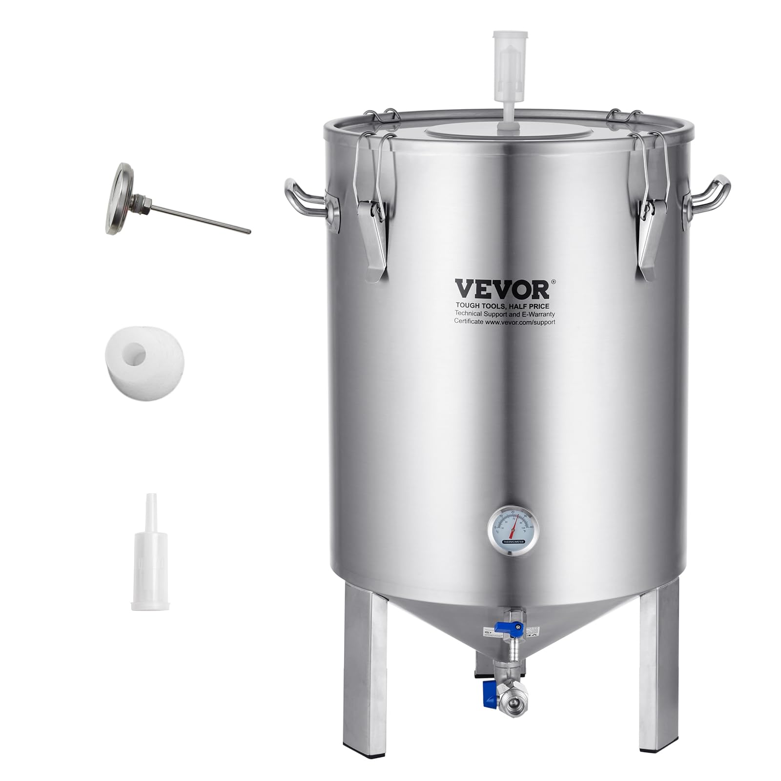 Vevor tanque de fermentación de 16 galones, fermentador de cerveza de acero inoxidable, fermentador de cubo de cerveza para elaboración casera con equipo de preparación de base cónica - gran capacidad: con una capacidad de fermentación de 16 galones, puede disfrutar de la satisfacción como desee. el diseño de boca ensanchada y agrandada hace que la alimentación sea más conveniente. las asas gruesas hacen que sea fácil levantar la olla sin esfuerzo. el diseño de fondo cónico es propicio para la acumulación y fermentación de sedimentos, con válvulas de lechada de levadura y válvulas de cerveza para facilitar la descarga de lodos de levadura y cerveza embotellada. - material 304 grueso: el barril de fermentación está hecho completamente de acero inoxidable, con el cuerpo del barril, las manijas, el forro interior, los cierres y la tapa del barril están hechos de acero inoxidable 304 de grado alimenticio. se puede utilizar con confianza. con un grosor de barril de 0.020 in, es resistente, duradero y resistente a la deformación. no es propenso a la acumulación de suciedad, lo que hace que la limpieza sea fácil. - sellada para mayor frescura: la tapa del barril cuenta con un anillo de sellado de silicona integrado, que proporciona protección de sellado de doble capa. el cierre de alta elasticidad garantiza un sellado hermético sin huecos, evitando que entren hormigas e insectos. garantiza que no haya fugas incluso cuando se invierte, y no se derramará durante el transporte o la agitación. - estéril y transpirable: la parte superior de la tapa se puede equipar con un tubo de escape, que se puede instalar fácilmente en segundos. el escape unidireccional permite liberar burbujas en el barril, e inyectar una pequeña cantidad de agua evita el reflujo, logrando una fermentación estéril y transpirable, libre de oxígeno. - visibilidad de la temperatura: el suministro de cerveza casera viene con un termómetro para un fácil monitoreo de la temperatura de fermentación en tiempo real. la escala es clara, con lecturas de temperatura celsius/fahrenheit, que van desde 32.0-104.0 °f/32-104°f. puede fermentar fácilmente cerveza, licores, vino, vino de frutas y más con ella.