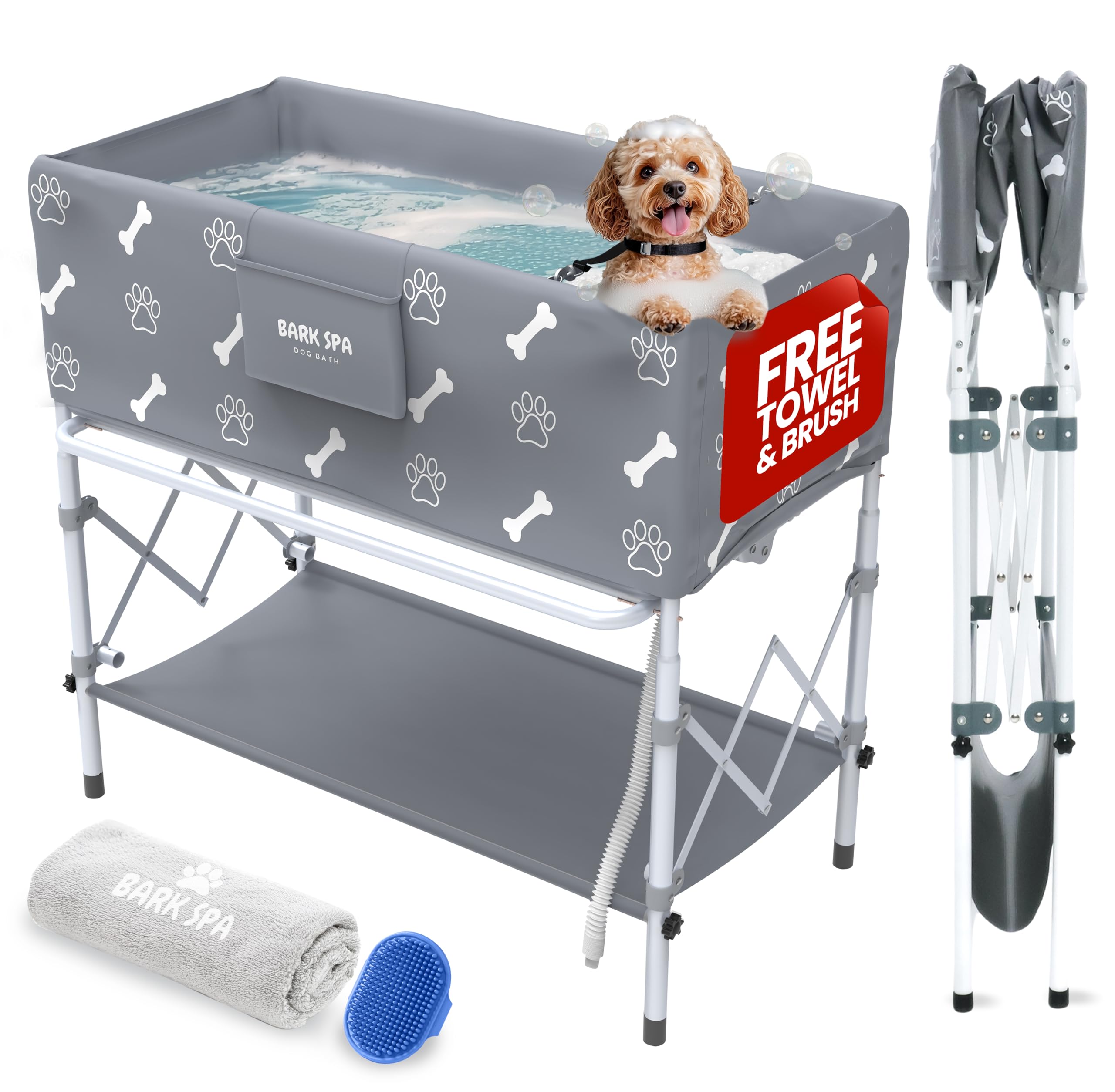 Asear a tu amigo peludo es mucho más fácil con este baño portátil para perros. di adiós al desorden y la molestia de los métodos de baño tradicionales. esta innovadora solución le permite bañar a su cachorro convenientemente, mientras mantiene su hogar limpio y seco. el diseño plegable hace que sea muy fácil de instalar y almacenar, por lo que puedes preparar a tu perro en cualquier lugar, en cualquier momento. con su espacioso interior y su construcción robusta, tu mascota se sentirá cómoda y segura durante el baño. trata a tu compañero canino con una experiencia similar a un spa con este baño portátil para perros que simplifica el proceso de aseo. - no más dobles: cómodo baño para perros en casa. el diseño elevado de 360 grados significa que no más dolor de rodillas o espalda mientras lavas a tu cachorro. disfruta de una experiencia de baño para perros sin estrés con acceso completo desde todos los ángulos, en interiores o exteriores. - espaciosa y segura: para perros de hasta 60 libras. diseñada para adaptarse a razas pequeñas, medianas y grandes, esta bañera para perros soporta mascotas de hasta 60 libras y las mantiene estables durante el baño gracias a la superficie antideslizante y al arnés integrado. - kit de aseo adicional: cepillo y toalla absorbente gratis viene con un cepillo de cerdas suaves bark spa para limpieza profunda y una toalla ultraabsorbente para secar, todo lo que necesitas para un spa completo para perros en casa. - drenaje integrado + se pliega en segundos. un orificio de drenaje integrado con una manguera elástica hace que la limpieza sea rápida y fácil, mientras que el diseño plegable hace que bark spa sea fácil de almacenar entre usos. - la mejor estación de lavado de perros: en cualquier lugar que la necesites, ya sea que la uses en tu ducha, baño, patio o patio trasero, bark spa convierte cualquier espacio en una conveniente estación de lavado de perros para aseo, enjuague o un baño completo.