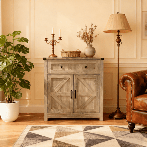 M&Ms - Light Gray-Washed Wood Farmhouse Barn-Door Storage Cabinet, Coffee Bar Buffet Sideboard With Drawer For Kitchen & Living Room | Lider Electrohogar