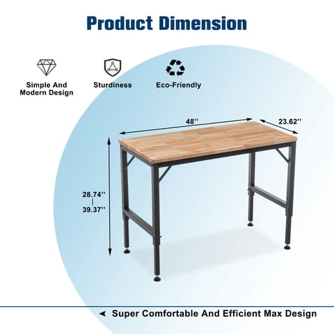 M&Ms - 48"" Heavy-Duty Adjustable Workbench For Garage, Rubber Wood Shop Table W/Rubber Pads, Hardwood Workstation Weight Capacity Over 2000 Lbs