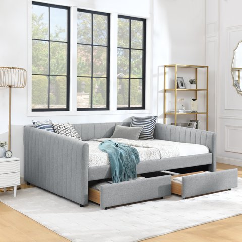 M&Ms - Queen Size Daybed With Two Drawers Trundle Upholstered Sofa Bed, With Vertical Stripes Linen Fabric, Grey (86.5""X65""X30"") | Lider Electrohogar